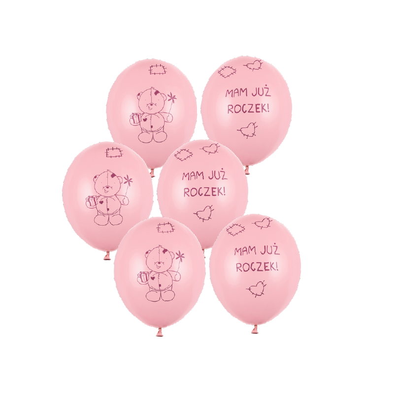 Balony nadruk mam już roczek miś - różowe 6 sztuk