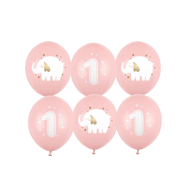 Balony nadruk roczek słonik - różowe 6 sztuk