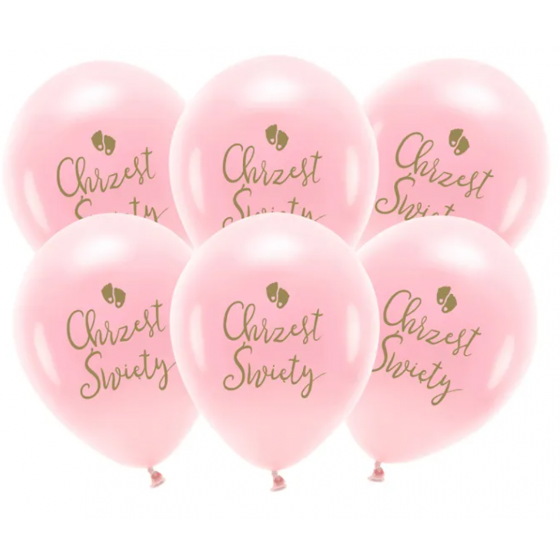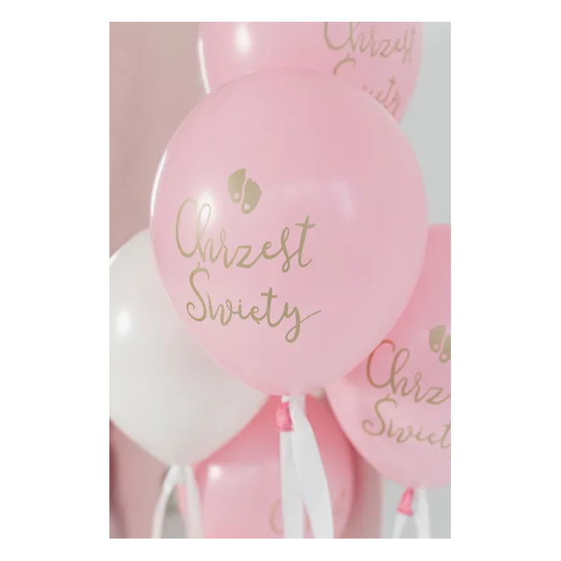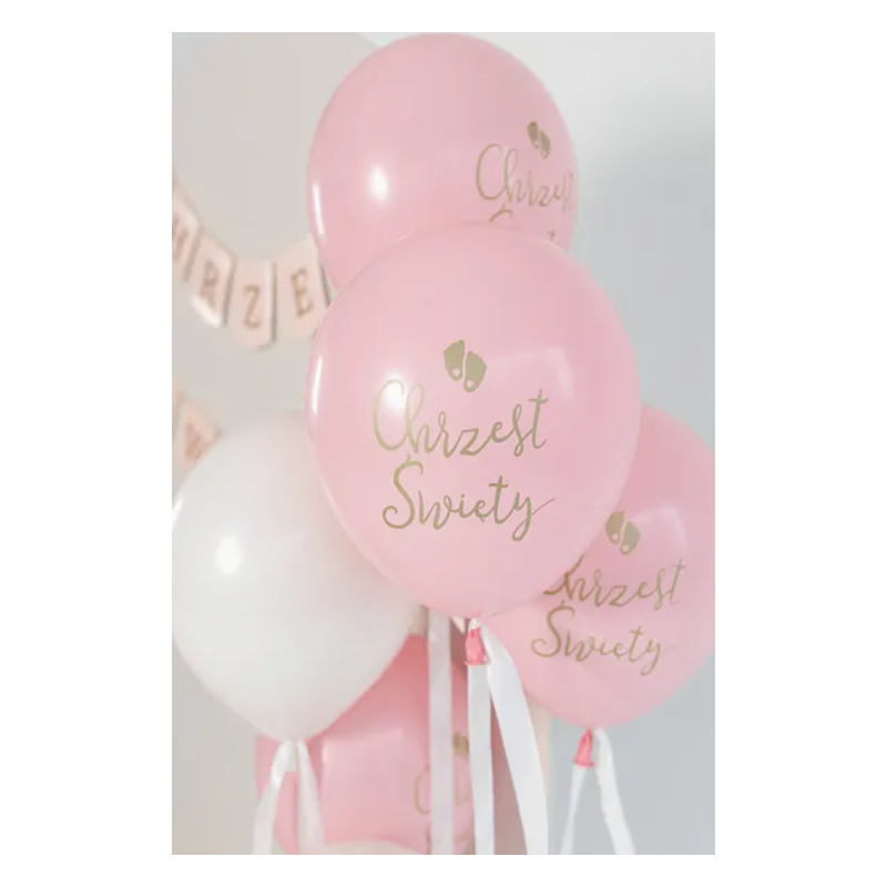 Wysokiej jakości balony lateksowe Eco w kolorze rumianoróżowym ze złotym dwustronnym nadrukiem Chrzest Święty.
