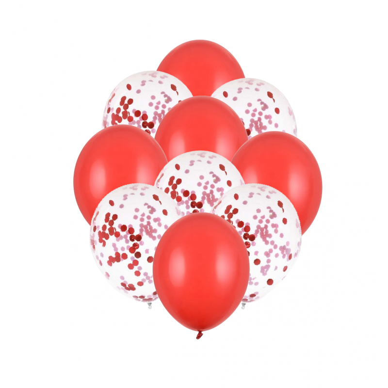 Zestaw 10 sztuk wysokiej jakości balonów lateksowych czerwonych i konfetti.