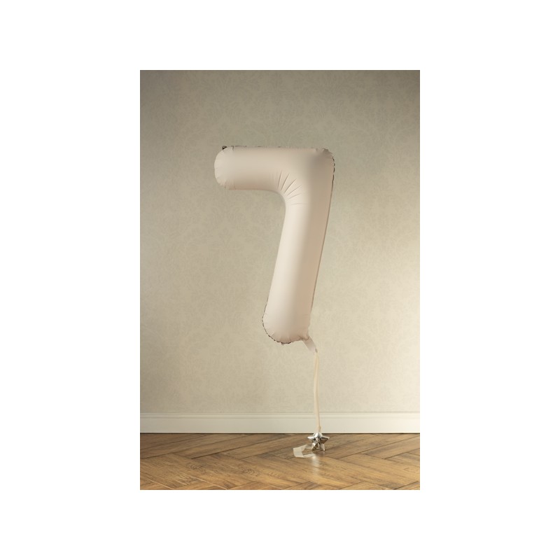 Balon foliowy matowy w kształcie cyfry 7 w kolorze jasnobeżowym.