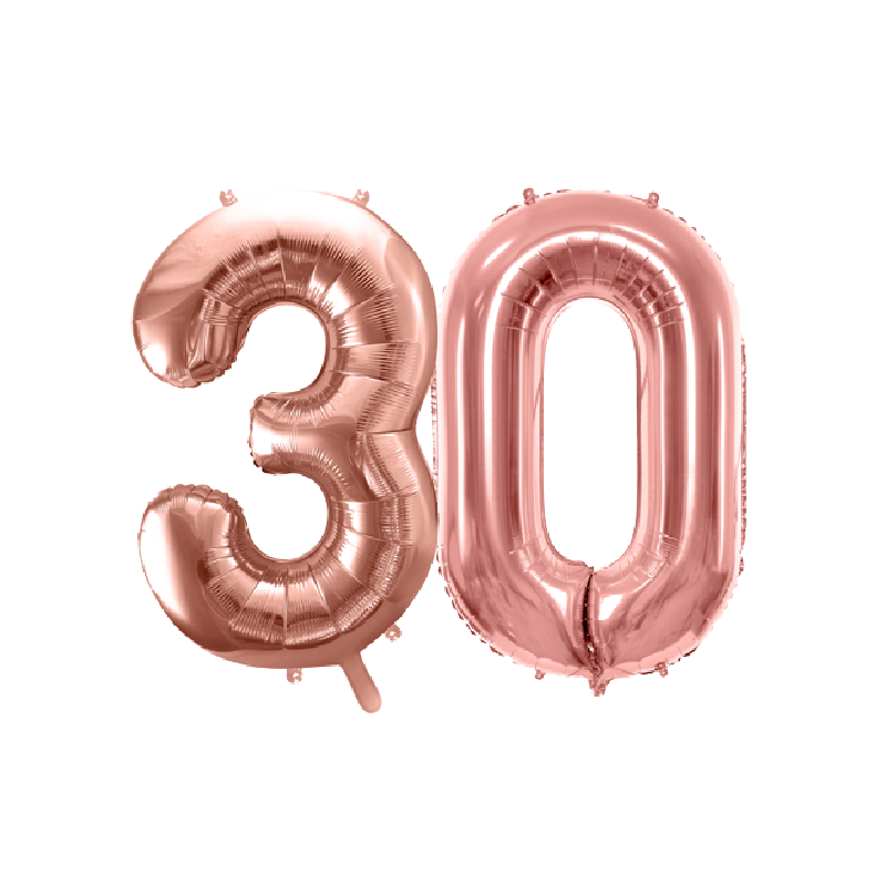 Balon foliowy metalizowany w kształcie 30 w kolorze różowego złota.
