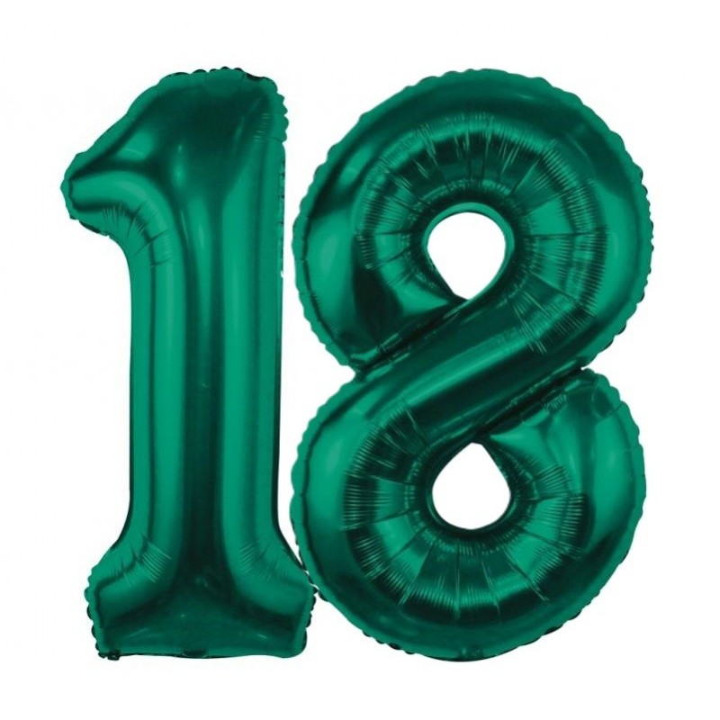 Balony foliowe metalizowane w kształcie 18 w kolorze ciemnej zieleni butelkowej.