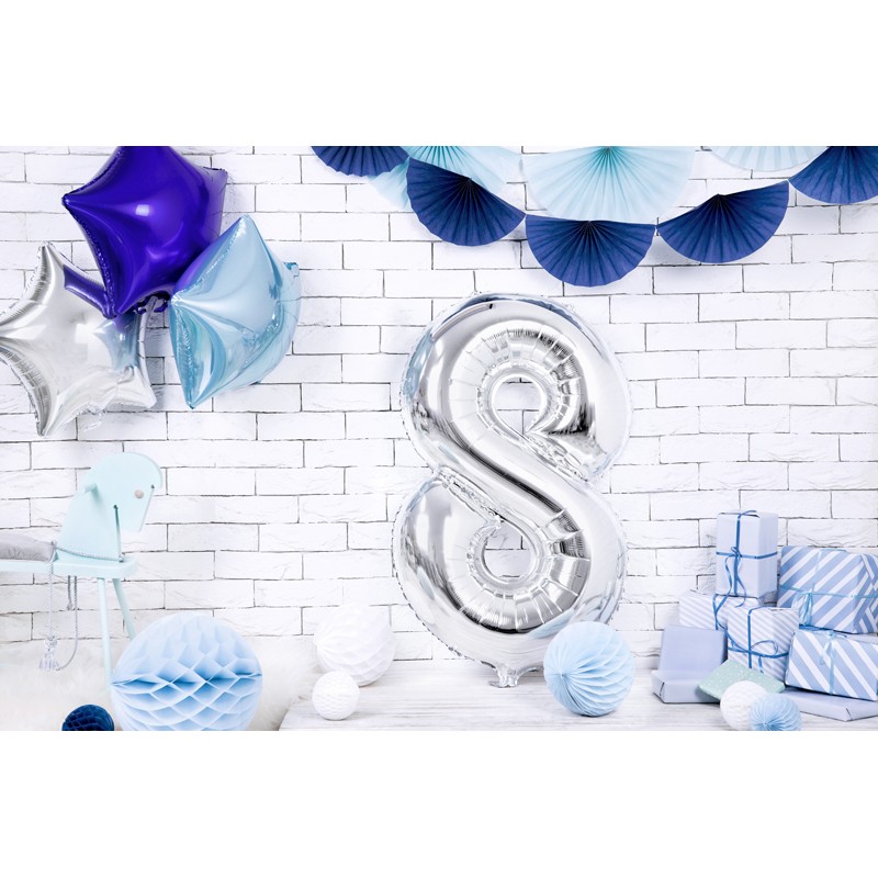 Balon foliowy metalizowany w kształcie 18 w kolorze srebrnym.