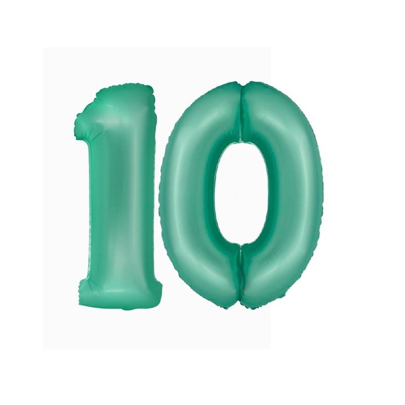 Balony foliowe w kształcie 10 w kolorze miętowym.
