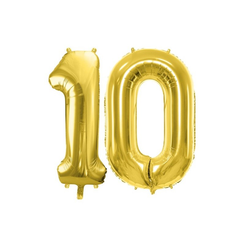 Balony foliowe w kształcie 10 w kolorze jasnozłotym.