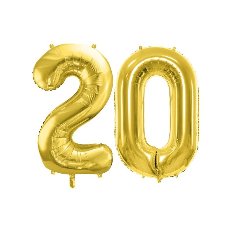 Balony foliowe w kształcie 20 w kolorze jasnozłotym.