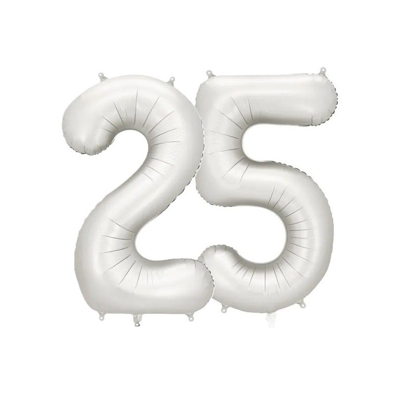 Balony foliowe w kształcie 25 w kolorze srebrnym satynowym.