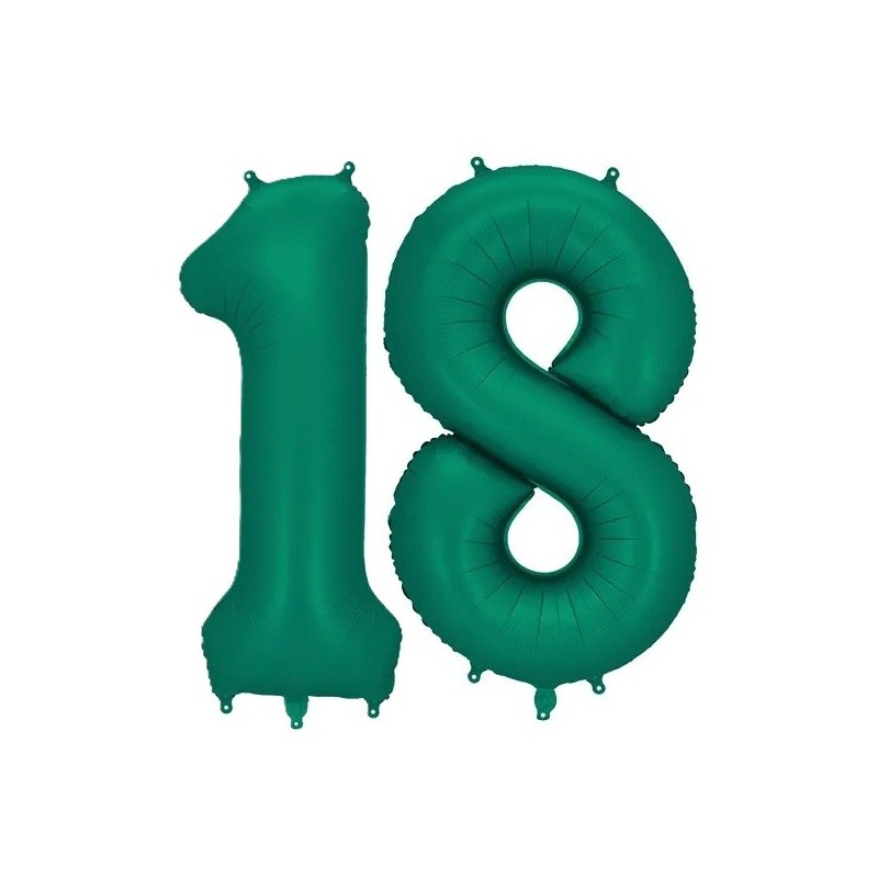 Balony foliowe w kształcie 18 w kolorze butelkowej zieleni.