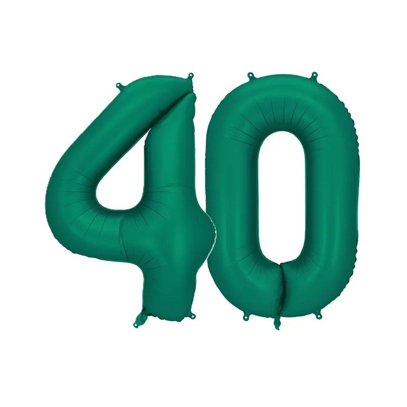 Balony foliowe w kształcie 40 w kolorze butelkowej zieleni.
