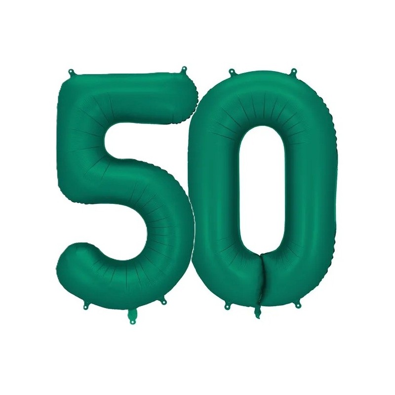 Balony foliowe w kształcie 50 w kolorze butelkowej zieleni.