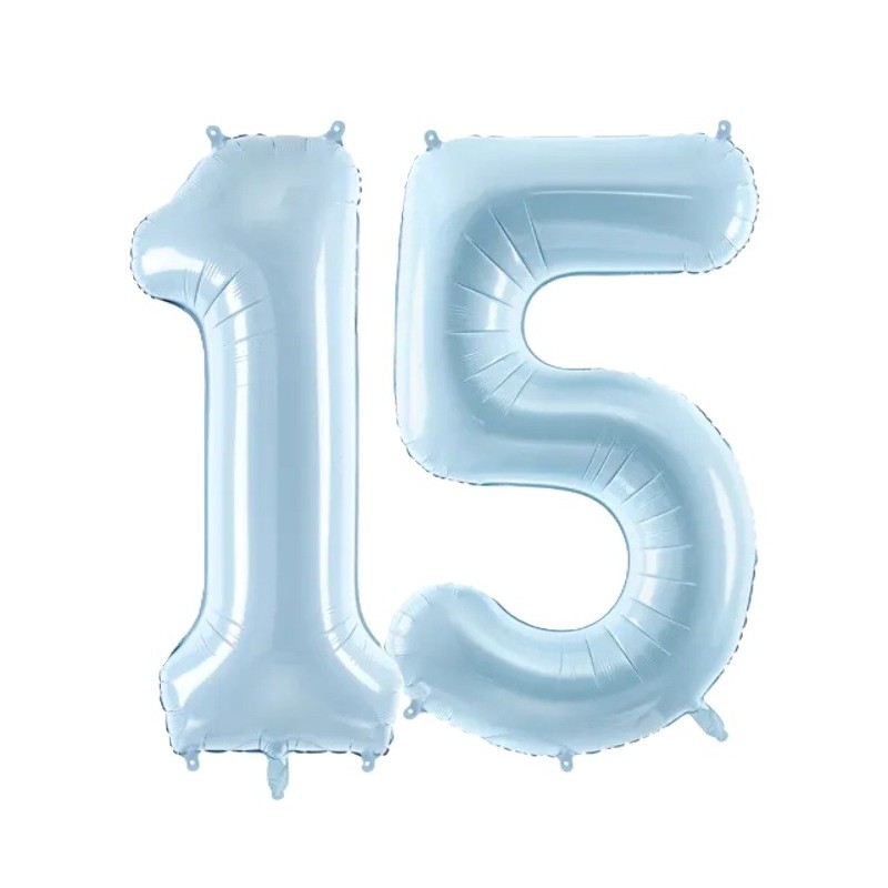 Balony foliowe w kształcie 15 w kolorze jasnoniebieskim.