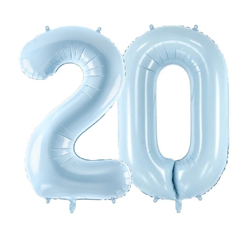 Balony foliowe w kształcie 20 w kolorze jasnoniebieskim.