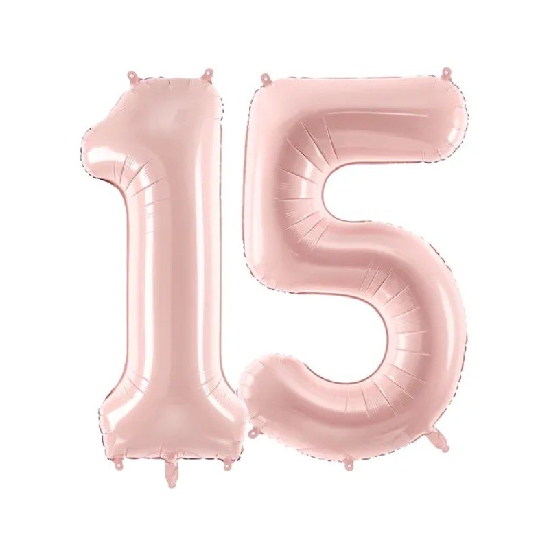 Balony foliowe w kształcie 15 w kolorze jasnoróżowym.