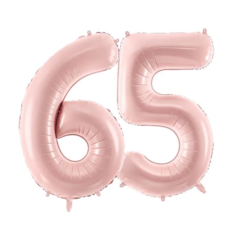 Balony foliowe w kształcie 65 w kolorze jasnoróżowym.