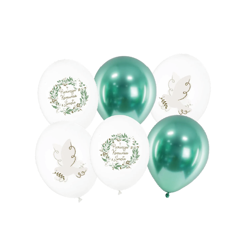 Zestaw balonów komunia - 6 sztuk Zestaw wysokiej jakości balonów lateksowych. Idealna i niezastąpiona dekoracja każdego przyjęcia! Nasze balony są mocne i baaardzo wytrzymałe :) Gwarantujemy, że ich jakość pozytywnie Cię zaskoczy! OPIS: W komplecie: - 2 balony lateksowe 30 cm zielone gloss - 2 balony lateksowe 30 cm - gołąbek przezroczyste - 2 balony komunijne Pierwsza Komunia Święta 30 cm Balony unoszą się na hel Jeśli chcesz, by balony się unosiły - napełnij je helem.