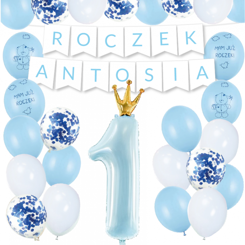 Box balonowy ROCZEK + IMIĘ - jasny niebieski + 1 niebieska ze złotą koroną + mam już roczek