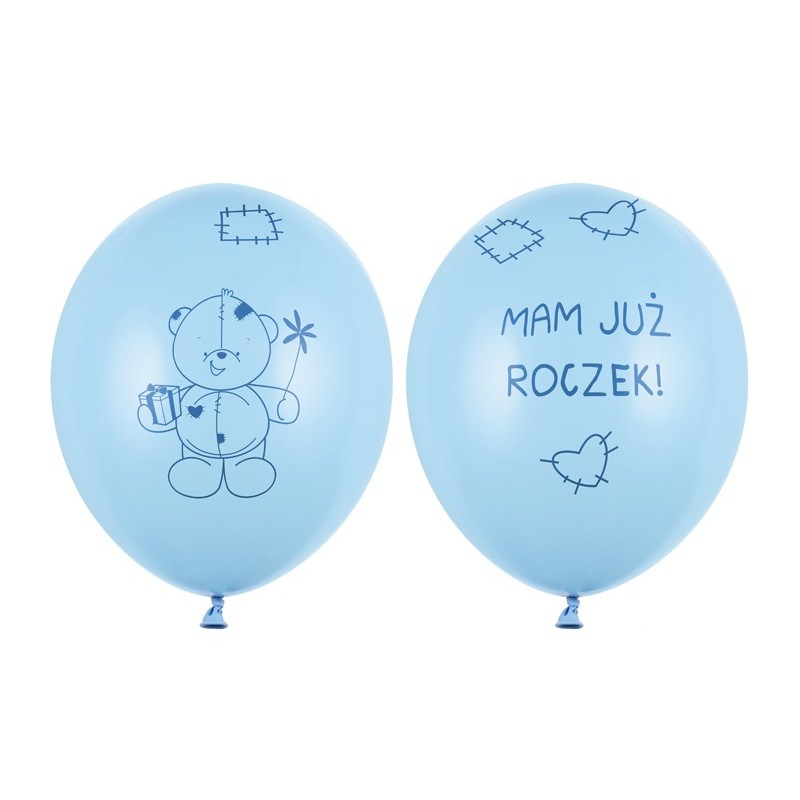 ⭐ 4 balony lateksowe 30 cm - Miś - mam już roczek w kolorze Pastel Blue (trzystronny nadruk: z obu stron oraz z góry)