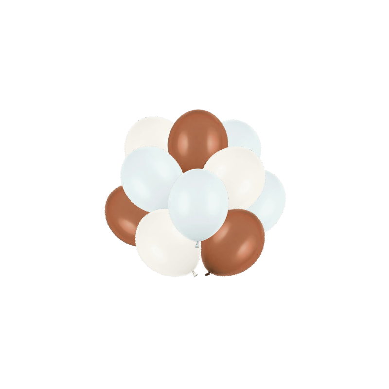 Zestaw 10 sztuk wysokiej jakości balonów lateksowych w kolorach złamanej bieli, mglisto niebieskim, kawowym.