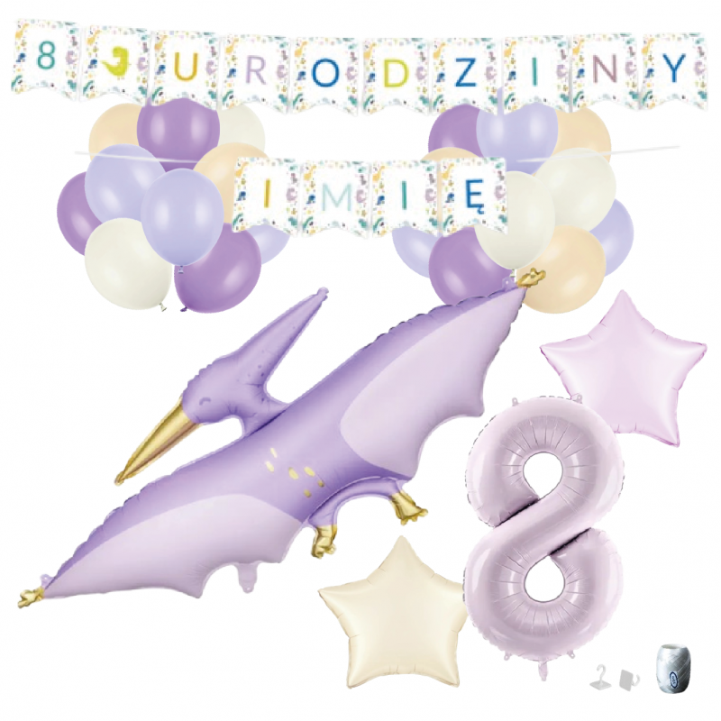 Zestaw balonów DINOZAUR FIOLETOWY + Girlanda 8 URODZINY + IMIĘ