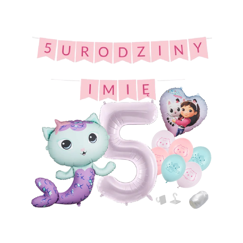 Zestaw na 5 URODZINY + IMIĘ - KOCI DOMEK GABI - Syrenkotka, serce - 12 sztuk