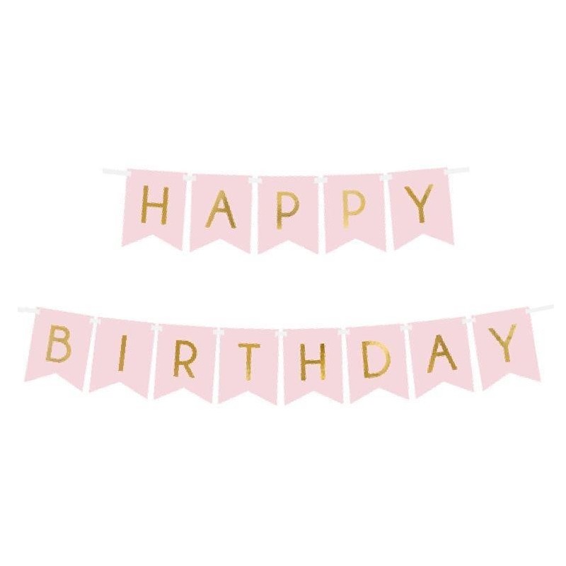 ⭐Girlanda "Happy Birthday" różowa, złoty napis - 1,75 m - 1 sztuka