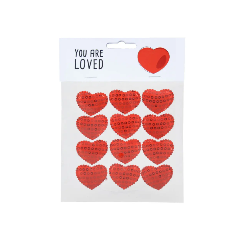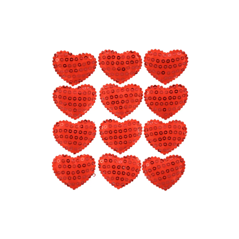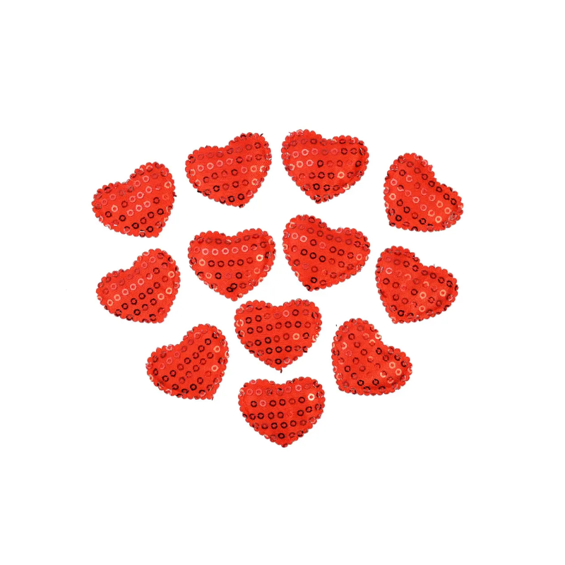 Naklejki w kształcie czerwonych serc wykonane z materiału pokrytego połyskującymi cekinami.