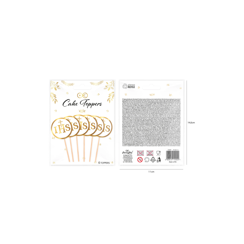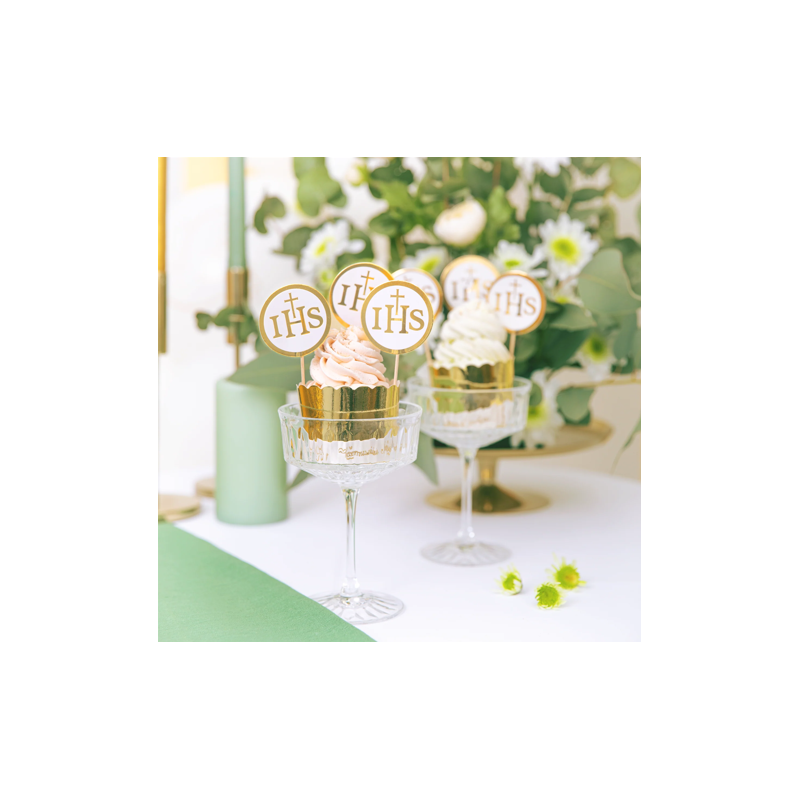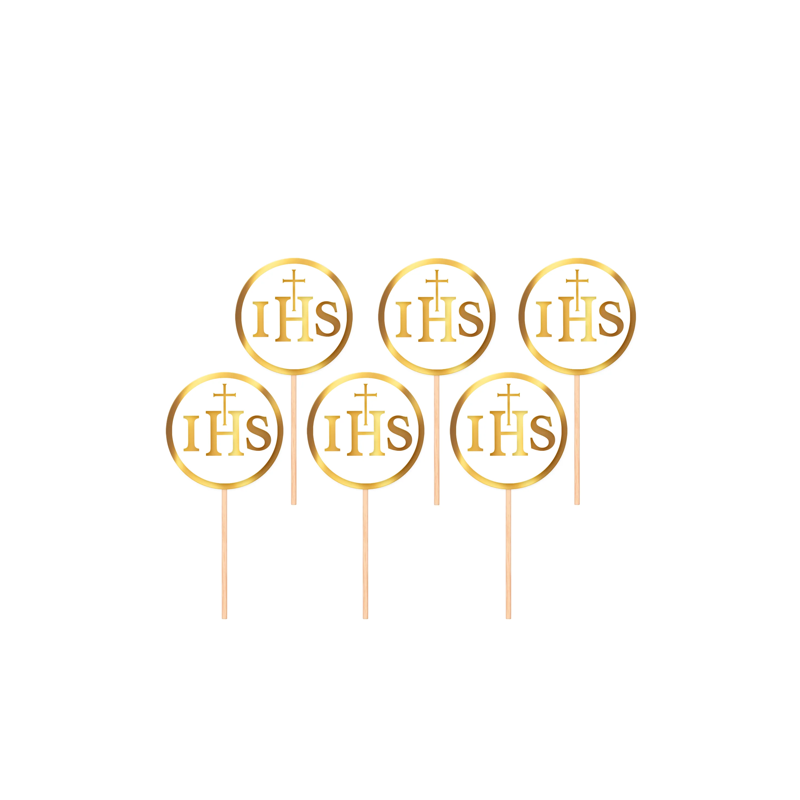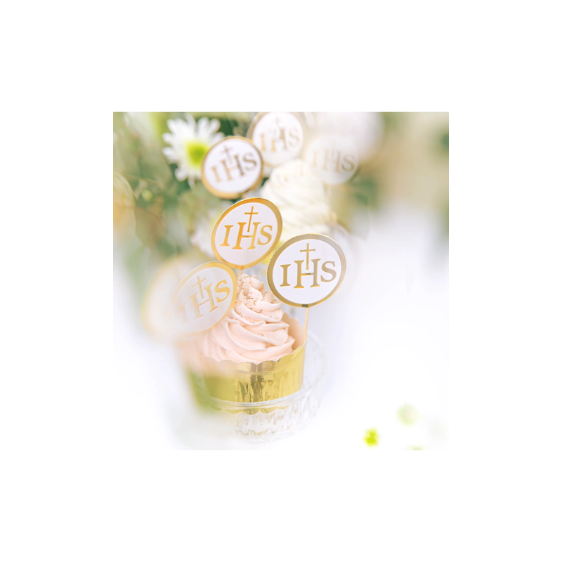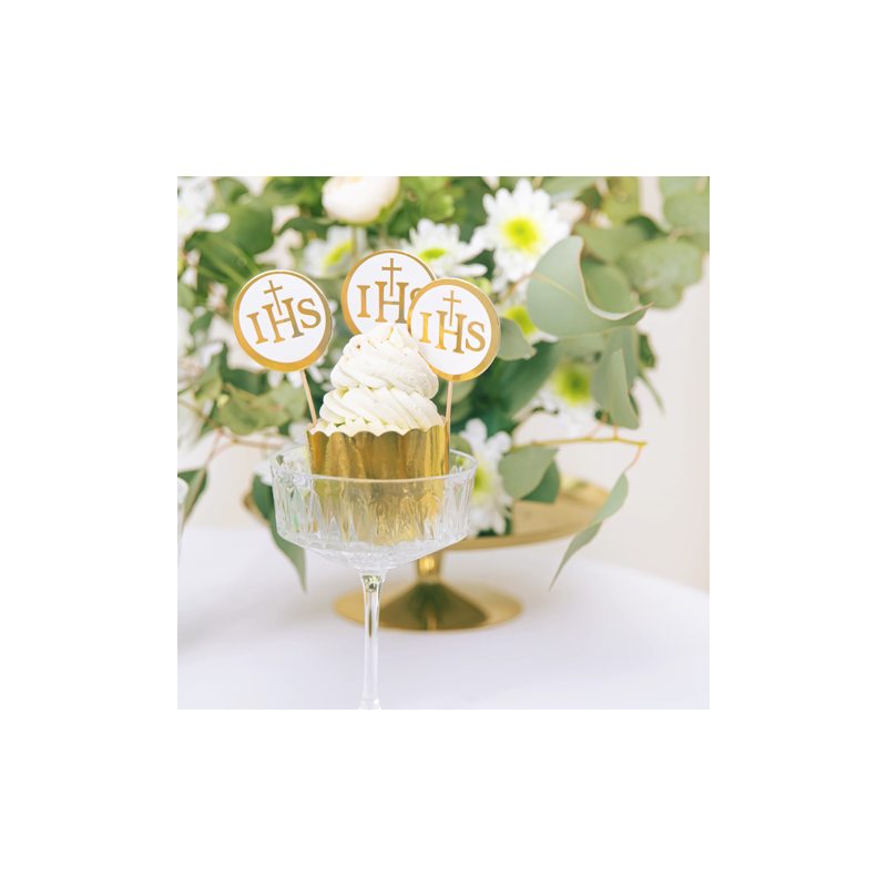 Toppery na tort komunijny IHS biało-złote - 6 sztuk