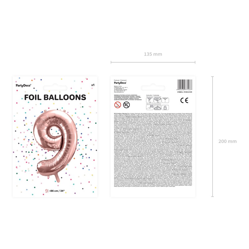 Balon foliowy metalizowany w kształcie 9 w kolorze róźowozłotym.