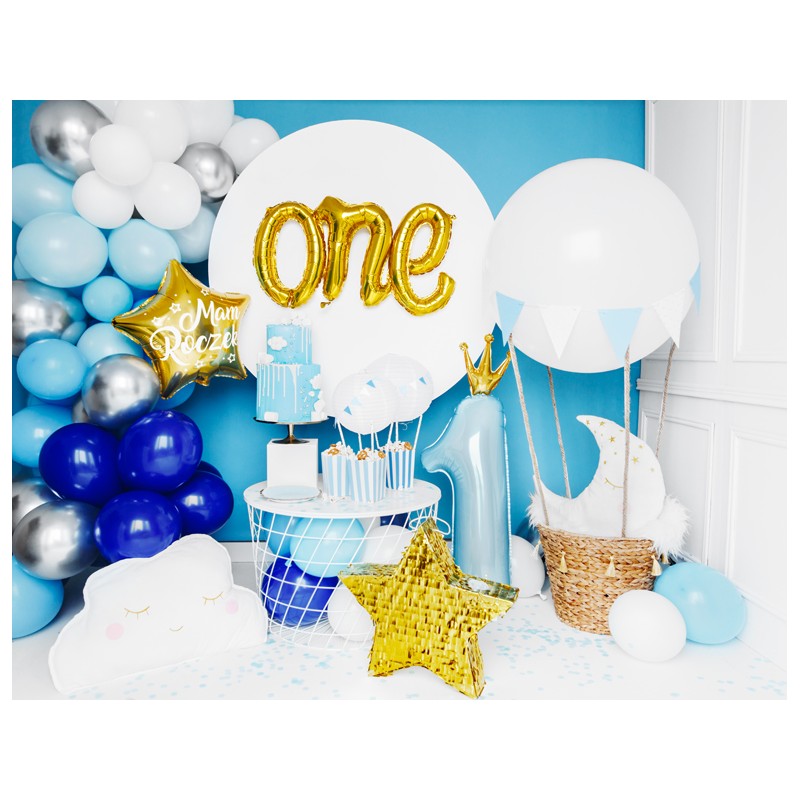 Duży foliowy balon w kształcie cyfry 1 z koroną.